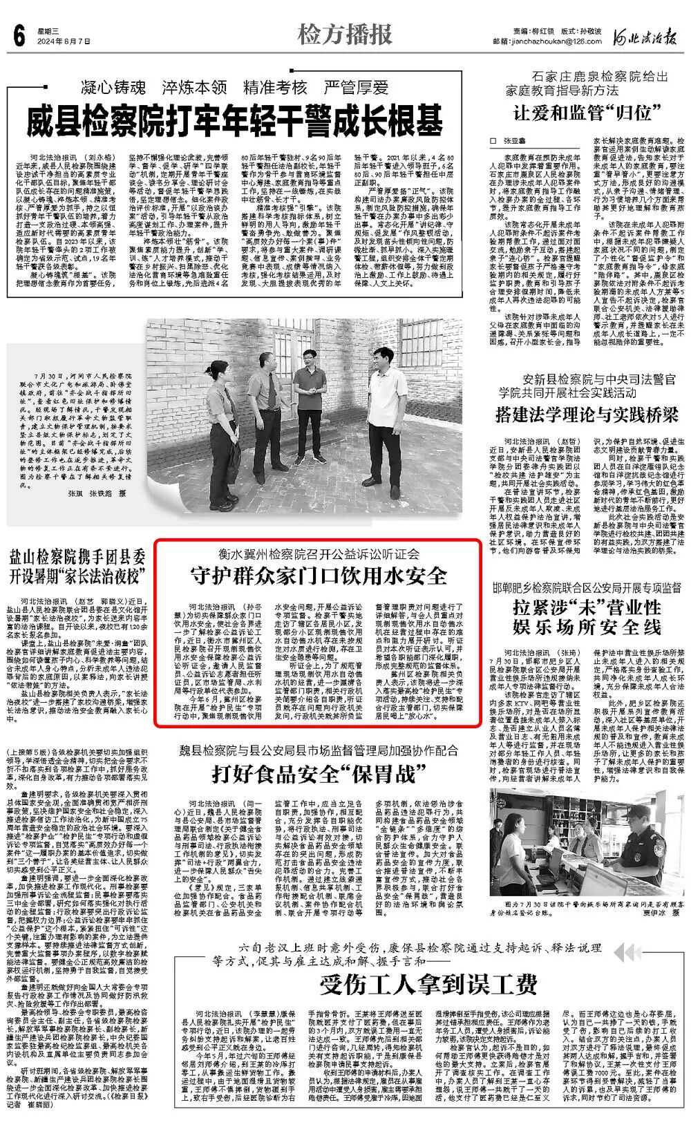 刊载原文: 守护群众家门口饮用水安全河北法治报讯 (孙冬慧)为切实保障群众家门口饮用水安全,使社会各界进一步了解检察公益诉讼工作,近日,衡水市冀州区人民检察院召开现制现售饮用水安全保障检察公益诉讼听证会,邀请人民监督员、公益诉讼志愿者担任听证员,区市场监管局、水利局等行政单位代表参加。今年6月,冀州区检察院在开展“检护民生”专项行动中,聚焦现制现售饮用水安全问题,开展公益诉讼专项监督。检察干警实地走访了辖区各居民小区,发现部分小区现制现售饮用水自动售水机存在未按规定对水质进行检测,存在卫生安全隐患等问题。听证会上,为了规范管理现场现制饮用水自动售水机的经营,进一步厘清各监管部门职责,相关行政机关简要介绍各自职责,听证员就存在问题向行政机关发问,行政机关就其所负监督管理职责对问题进行了详细解答,与会人员重点对现制现售饮用水自动售水机在经营过程中存在的难点和阻力展开研讨。听证员对本次听证表示认可,并希望各职能部门深化履职,形成完整规范的监督体系。冀州区检察院相关负责人表示,该院将进一步深入落实最高检“检护民生”专项活动,持续关注、支持和配合行政主管部门,切实保障居民喝上“放心水”。