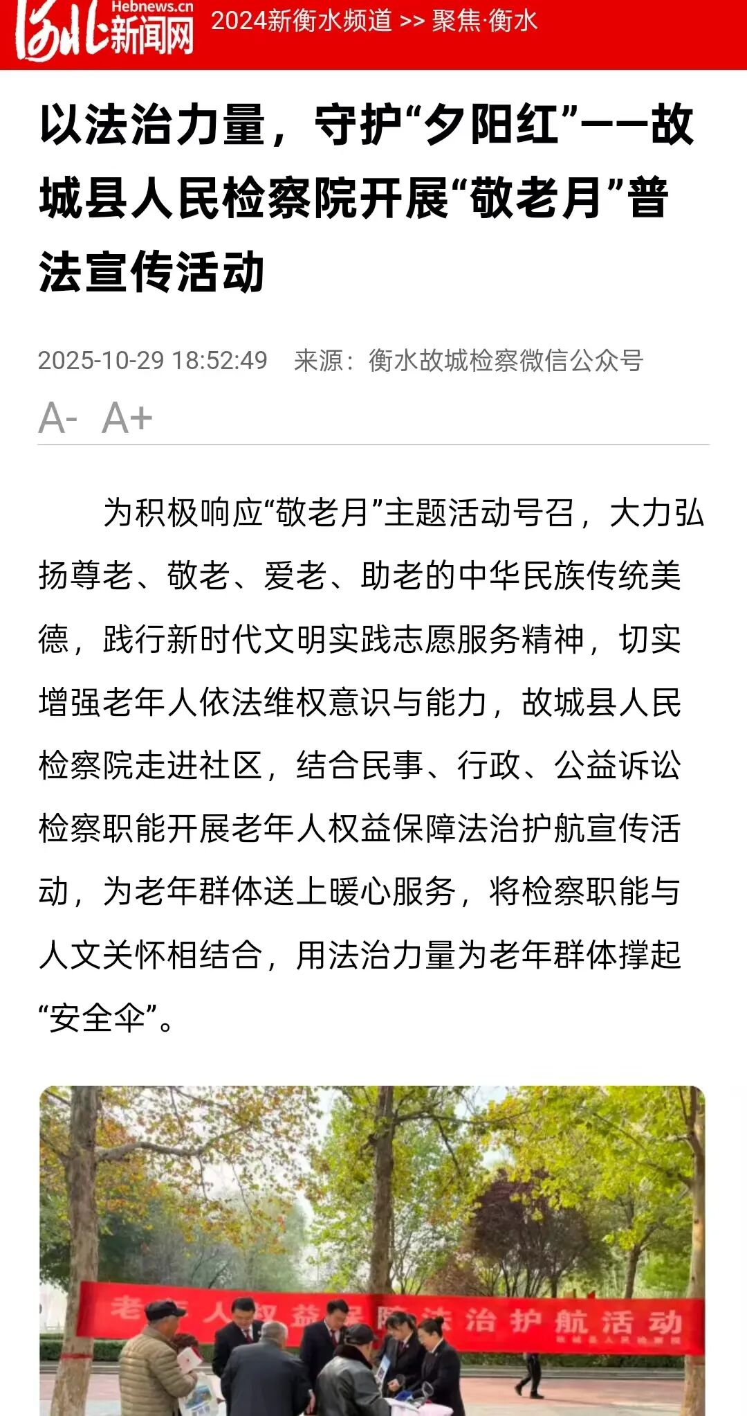 刊发原文: 为积极响应“敬老月”主题活动号召,大力弘扬尊老、敬老、爱老、助老的中华民族传统美德,践行新时代文明实践志愿服务精神,切实增强老年人依法维权意识与能力,故城县人民检察院走进社区,结合民事、行政、公益诉讼检察职能开展老年人权益保障法治护航宣传活动,为老年群体送上暖心服务,将检察职能与人文关怀相结合,用法治力量为老年群体撑起“安全伞”。