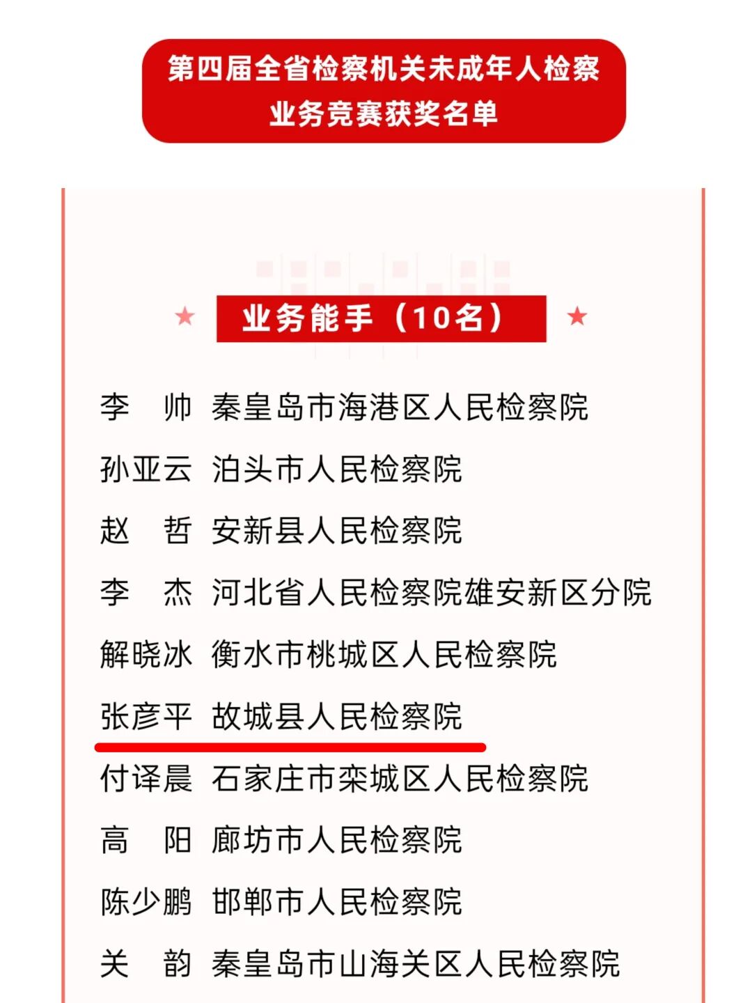 近日,第四届全省检察机关未成年人检察业务竞赛圆满落幕。故城县检察院选派的干警张彦平,从全省参赛者中脱颖而出,荣获“业务能手”称号。