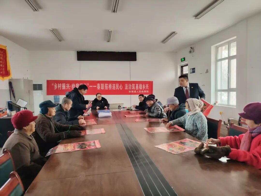 新春将至,年味渐浓。为深入践行司法为民宗旨,把新春祝福与法治关怀送到村民身边,助力乡村振兴,故城县人民检察院组织干警深入两个派驻乡村开展“乡村振兴?检察同行”春联赠送活动,以红联寄情、以普法暖心,为乡村大地绘就浓浓年味与法治底色。