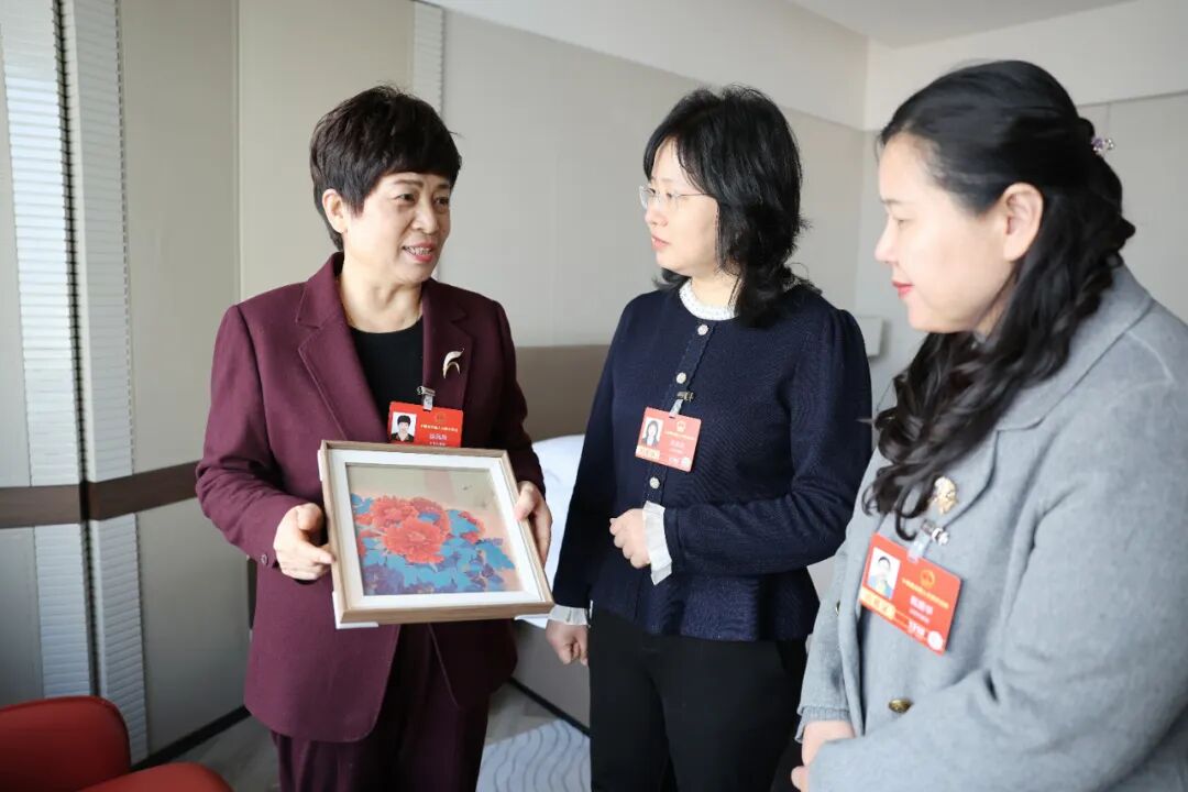 3月3日,全国人大代表徐凤秋(左)向全国人大代表关志洁(中)、甄爱华(右)介绍山东省级非遗项目巨野工笔牡丹画工艺。