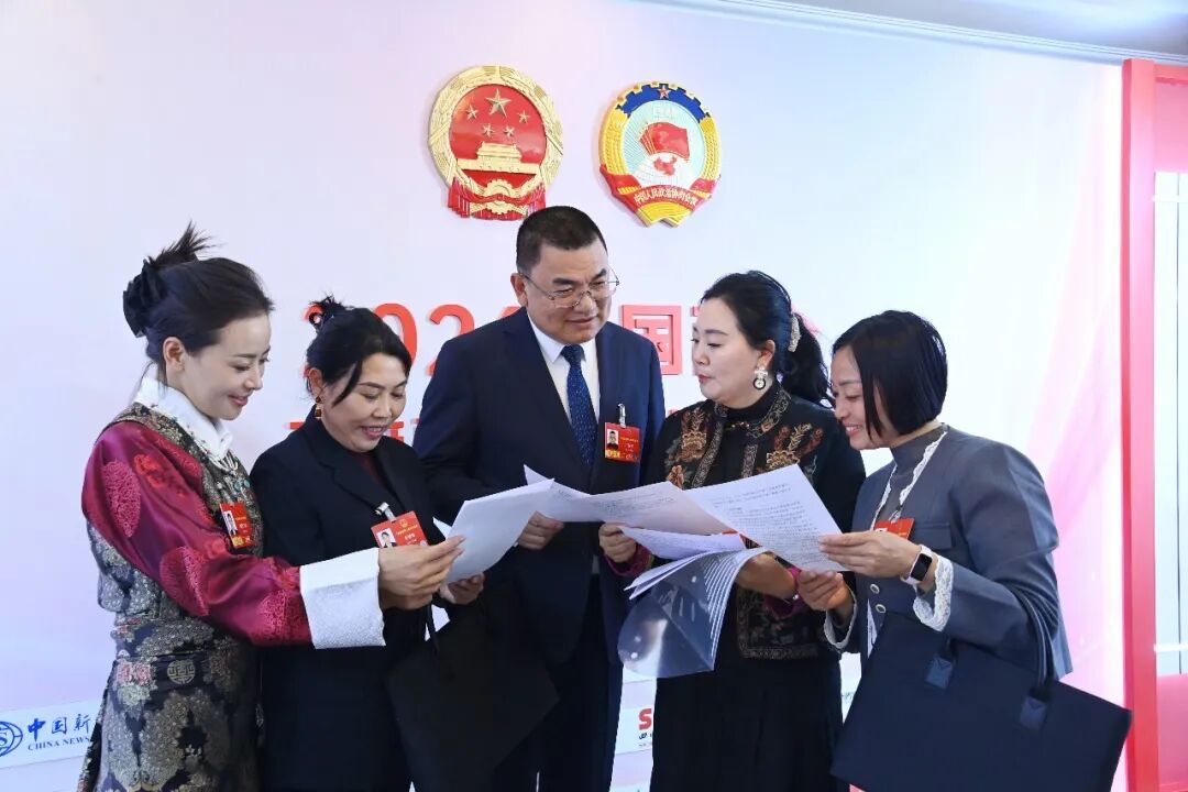 3月3日,四川代表团全体会议前,全国人大代表格西王姆(左一)、余德春(左二)、江吉村(左三)、乔进双梅(右二)、刘艳英(右一)进行交流。