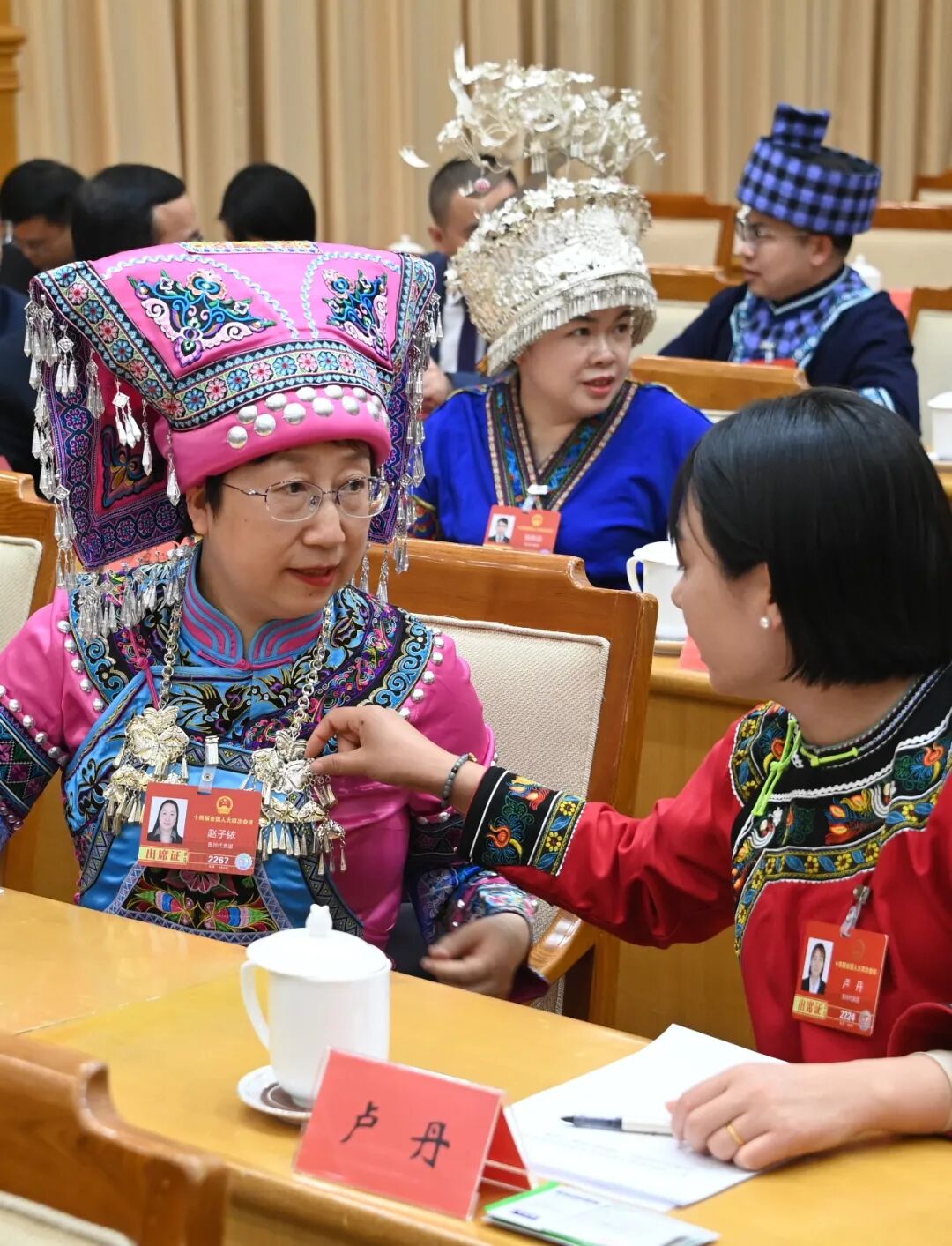 3月3日,出席十四届全国人大四次会议的贵州团全国人大代表抵达代表驻地,并举行贵州团全体会议。全国人大代表赵子铱(左)与全国人大代表卢丹(右)在会前进行交流。