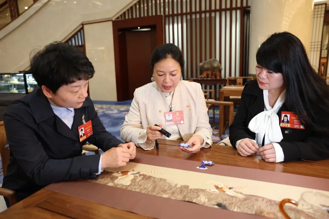 3月3日,全国人大代表成新湘(中)热情地向曾莲英代表(左)、刘玲琍代表(右)展示《凤穿牡丹》系列变色湘绣饰品。